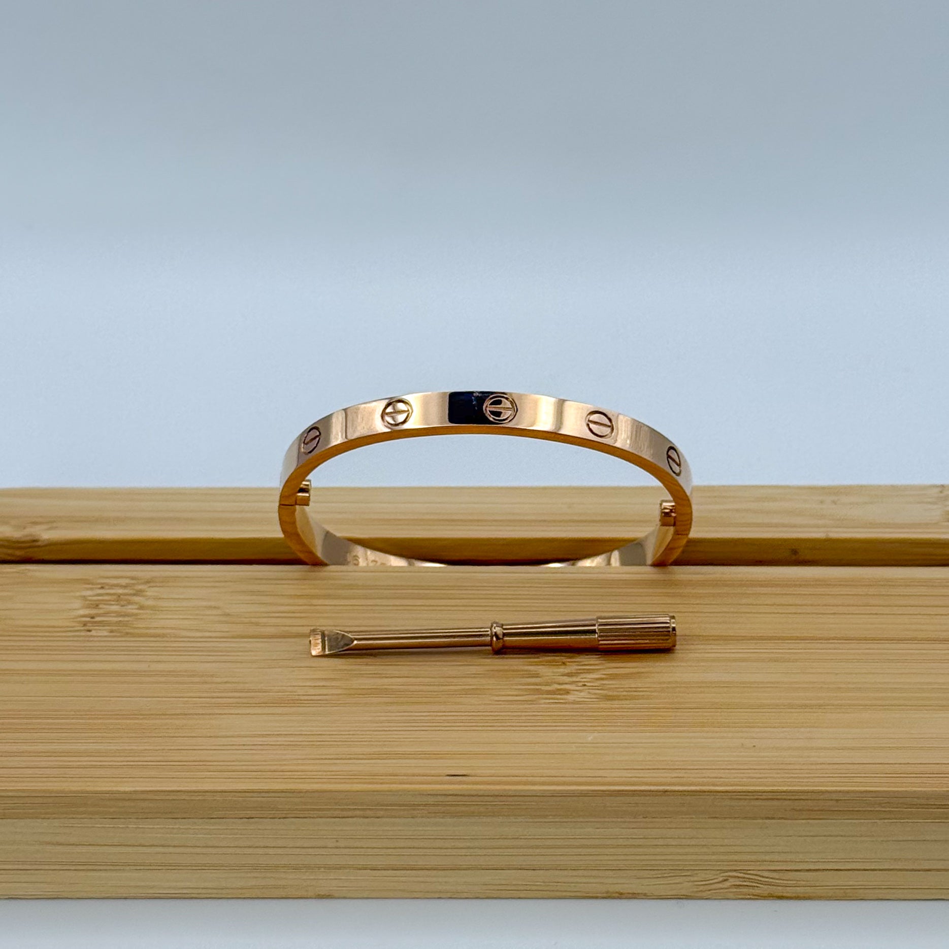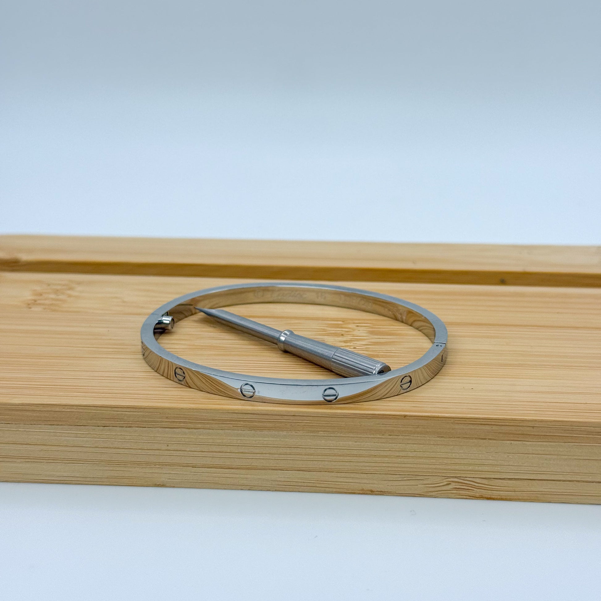 El brazalete ETERNA, hecho en acero inoxidable de alta durabilidad, combina estilo y resistencia. Disponible en varios colores y tamaños, este bangle permanente incluye un destornillador para que puedas ponerlo y quitarlo fácilmente. Asegúrate de elegir el tamaño correcto para tu muñeca: